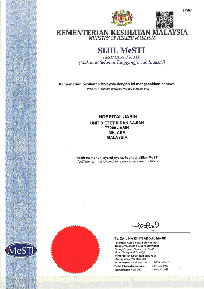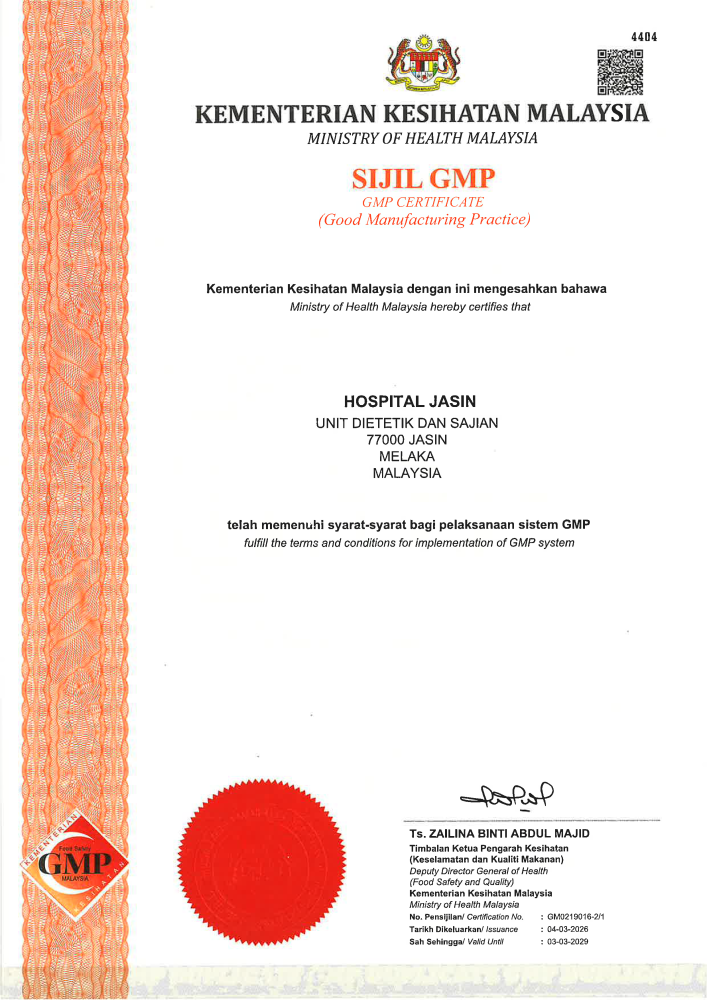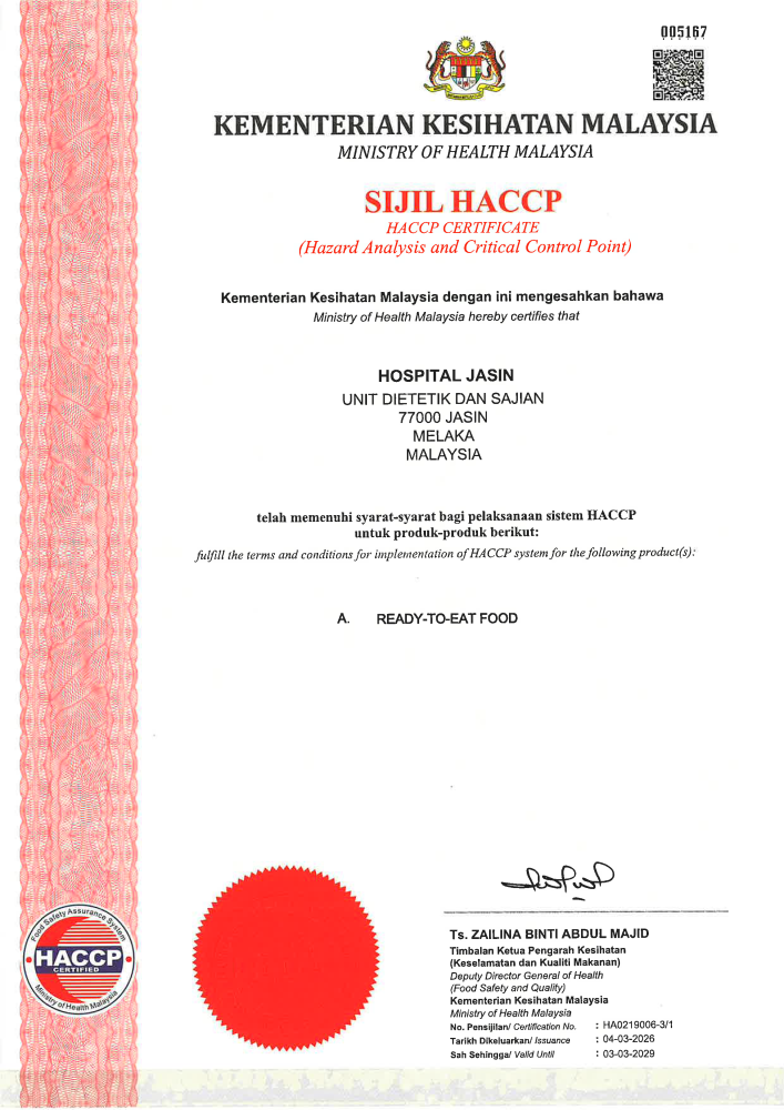 Pengiktirafan Hazard Analysis and Critical Control Points (HACCP) dan Good Manufacturing Practice (GMP) diwujudkan bagi memberi pengiktirafan rasmi kepada industri yang mencapai dan mengamalkan elemen-elemen HACCP dan GMP sekaligus memenuhi kehendak-kehendak keselamatan makanan dan kehendak pengguna. Sistem HACCP dan GMP dilaksanakan di Unit Dietetik dan Sajian Hospital Jasin secara bersinergi bermula dari pemilihan bahan mentah, penyimpanan, penyediaan, pemprosesan, plating sehingga menghidang kepada pesakit. Pensijilan HACCP dan GMP di Unit Dietetik dan Sajian Hospital Jasin yang berakhir pada 13 September 2025 telah pun diperbaharui bagi tempoh 3 tahun lagi bermula daripada 4 Mac 2026 sehingga 3 Mac 2029.