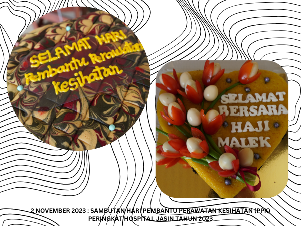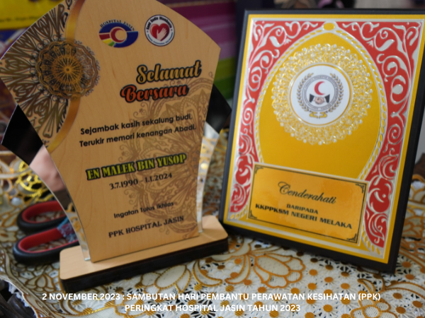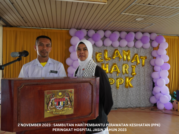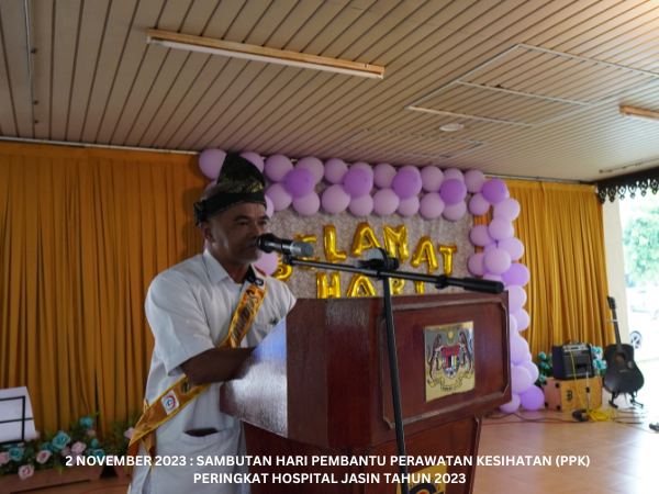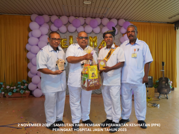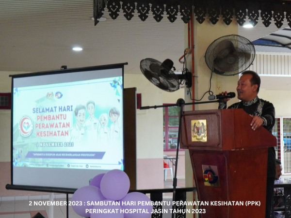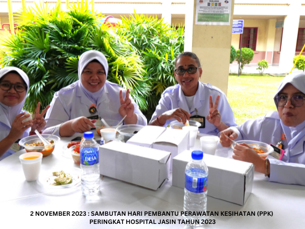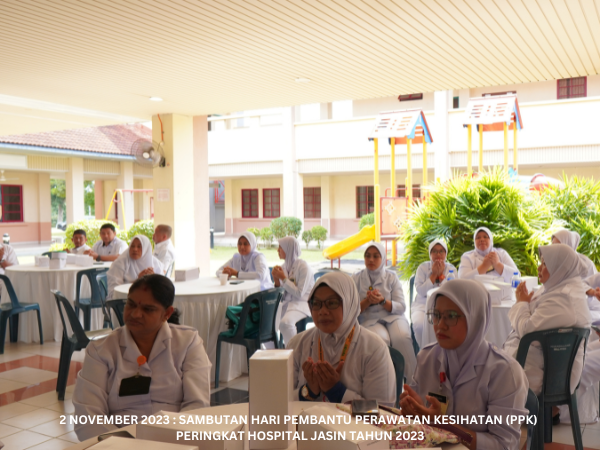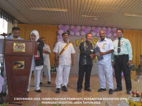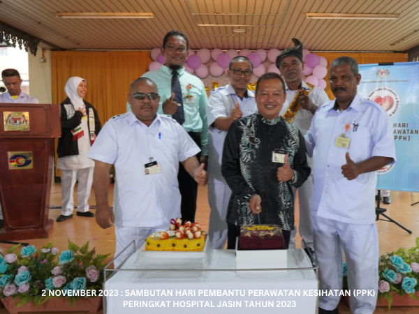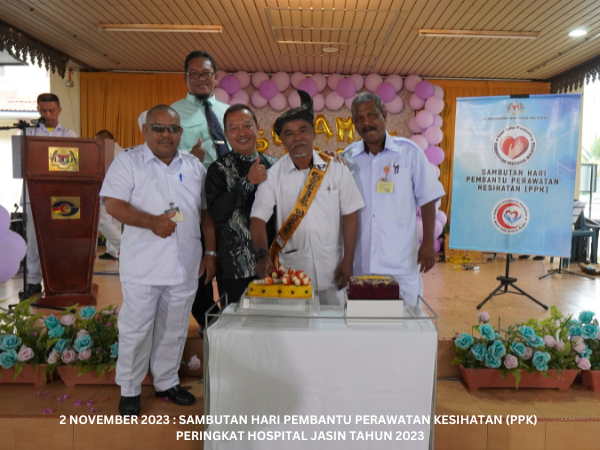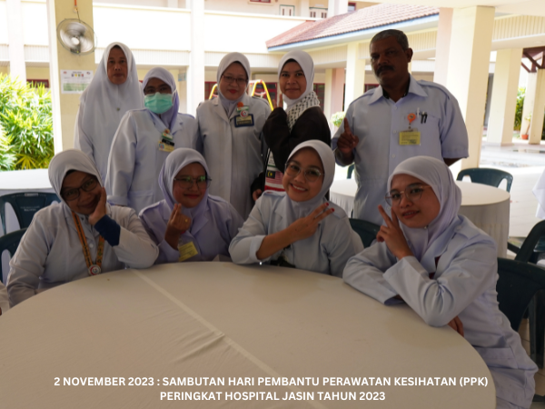 Majlis Sambutan Hari Pembantu Perawatan Kesihatan (PPK) Peringkat Hospital Jasin telah diadakan pada 2 November 2023 bertempat di Dataran Ilmu. Hospital Jasin dan dirasmikan oleh Dr. Azhar bin Mohd Sali, Pengarah Hospital Jasin. Majlis turut meraikan Tn. Hj. Malek bin Yusof, PPK Unit Patologi yang akan bersara mulai 1 Januari 2024.