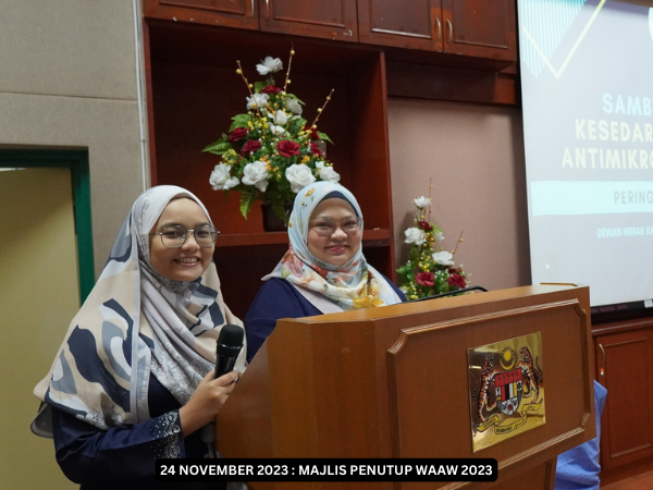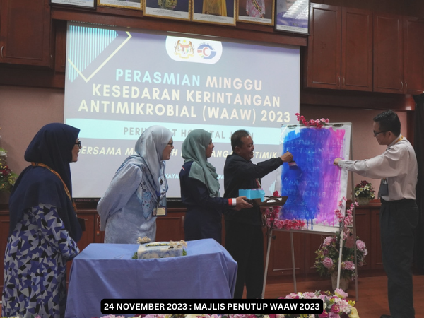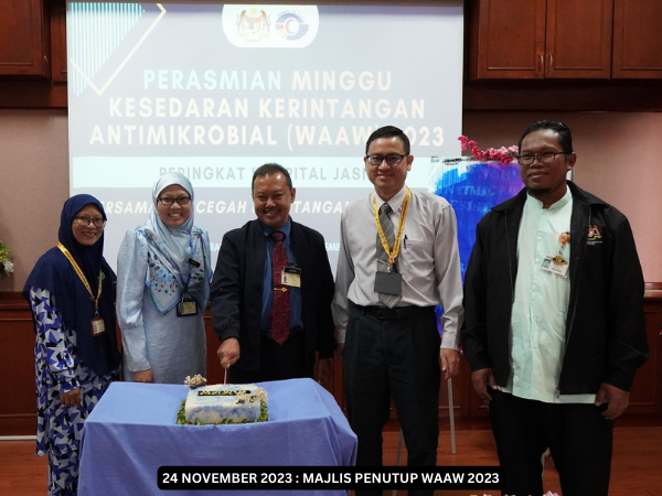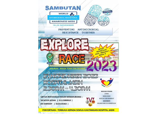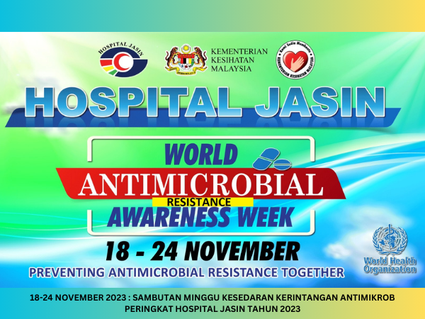 Sambutan Minggu Kesedaran Kerintangan Antimikrob (World Antimicrobial Awareness Week) Peringkat Hospital Jasin Tahun 2023 telah diadakan dari 18 hingga 24 November 2023. Pelbagai aktiviti menarik telah dijalankan sepanjang tempoh sambutan seperti pameran, program mewarna bersama anak-anak Taska Generasi Cergas Hospital Jasin, Explorace AMR, AMR Round dan Majlis penutup Minggu Kesedaran.