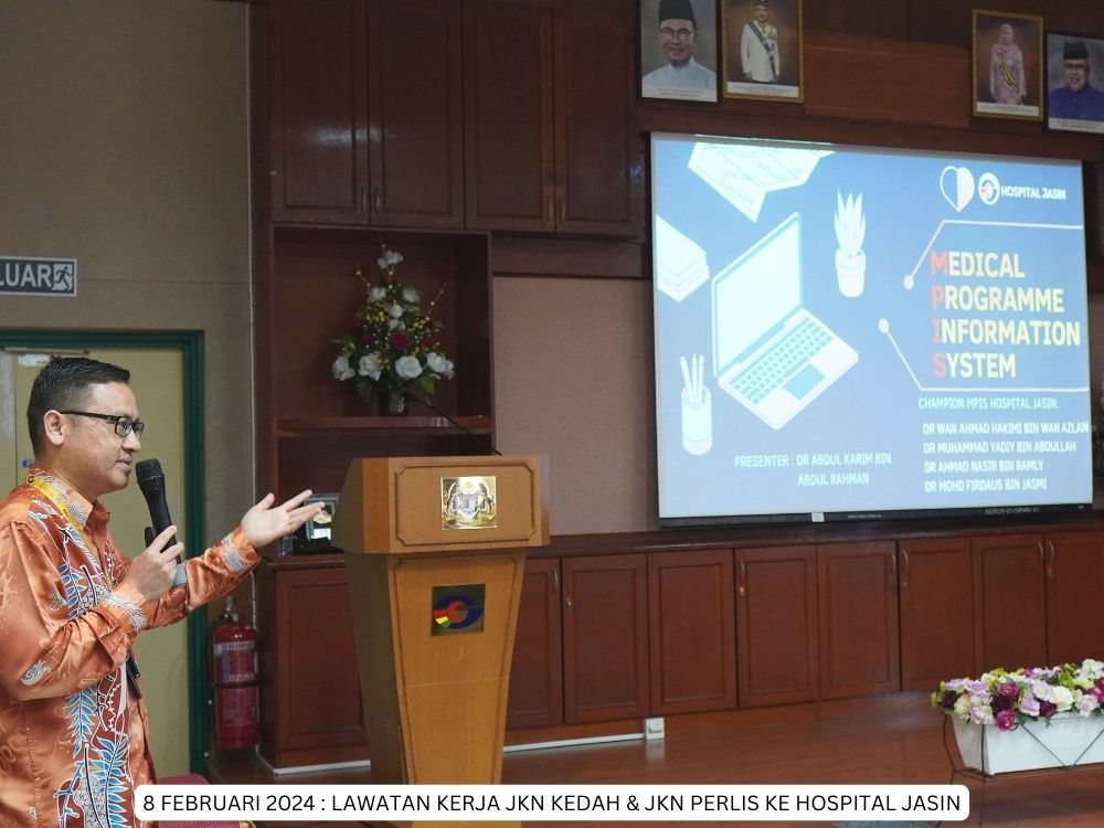Hospital Jasin amat berbesar hati kerana delegasi dari JKN Kedah dan Perlis telah sudi berkunjung ke Hospital Jasin pada 8 Februari 2024. Delegasi telah diberikan taklimat pelaksanaan Sistem MPIS di Hospital Jasin dan Hospital Alor Gajah serta melihat program-program kelestarian di Hospital Jasin.