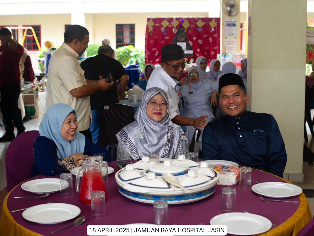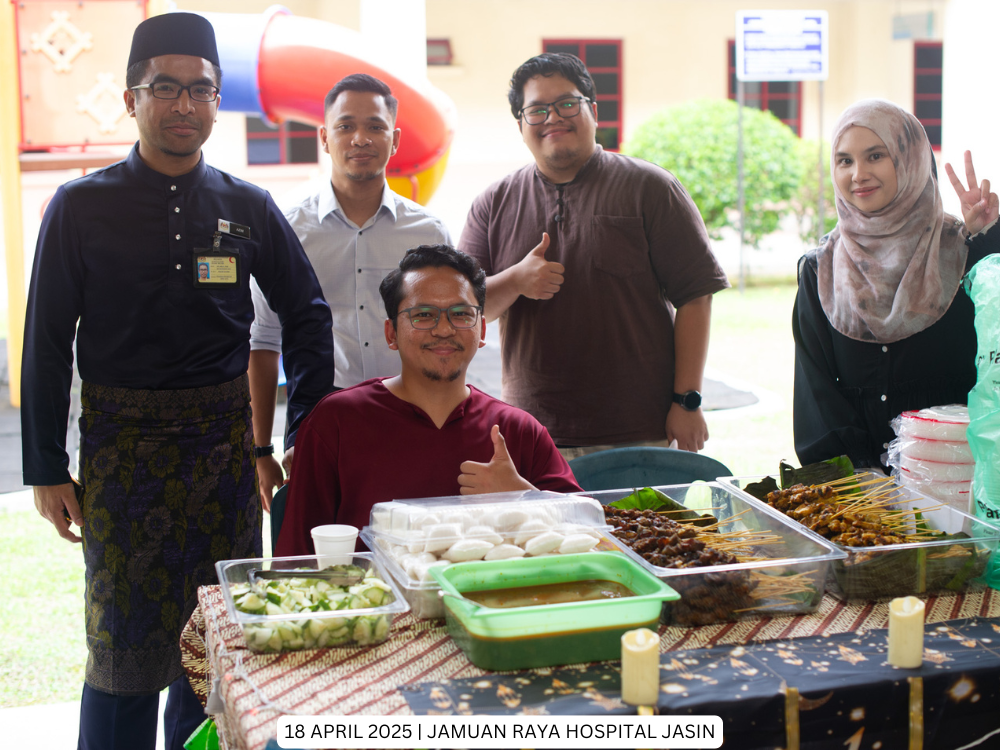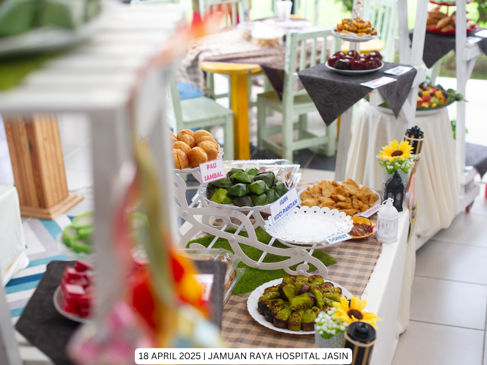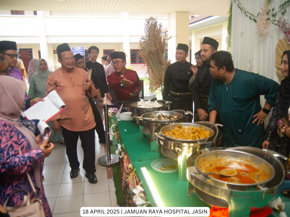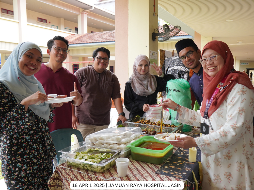 Hospital Jasin | 18 April 2025 - Sambutan Hari Raya tahun 2025 diserikan dengan jamuan hari raya peringkat Hospital Jasin. Pelbagai juadah hari raya disediakan oleh unit-unit melalui gerai masing-masing.