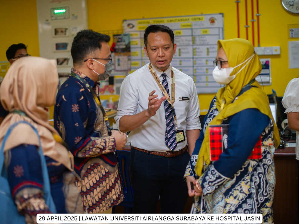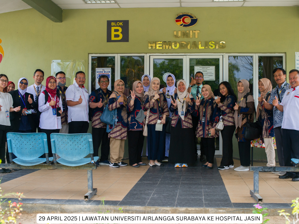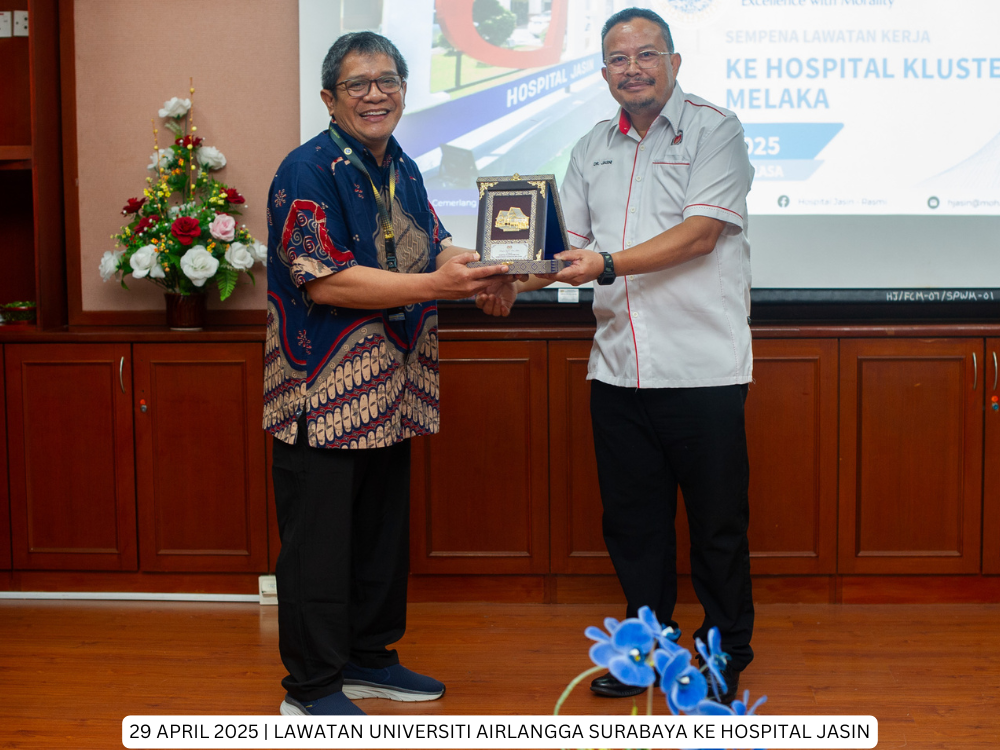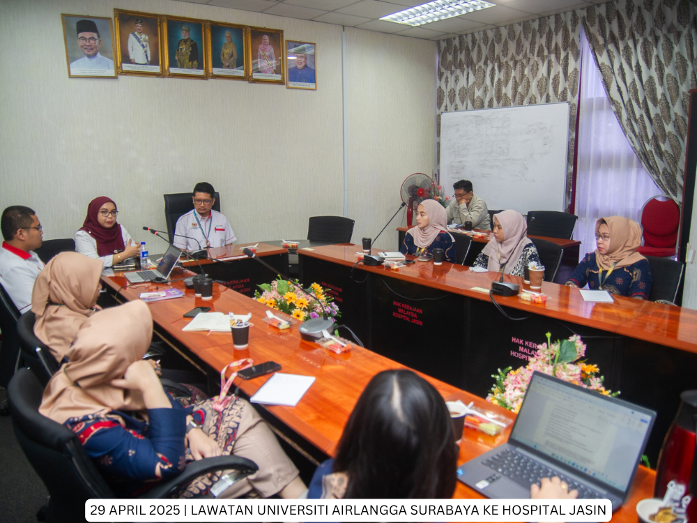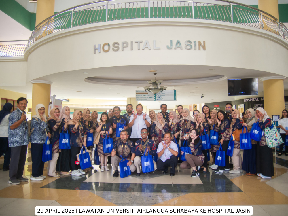 Hospital Jasin | 29 April 2025 - Hospital Jasin telah menerima kunjungan dari delegasi Fakultas Kesehatan Masyarakat, Universitas Airlangga, Indonesia yang bertujuan untuk membina jaringan kerjasama serantau di peringkat antarabangsa di antara Hospital Kluster Melaka dan Universitas Airlangga, Indonesia.