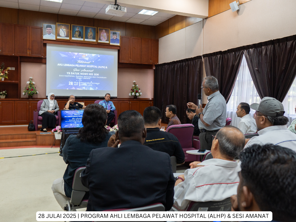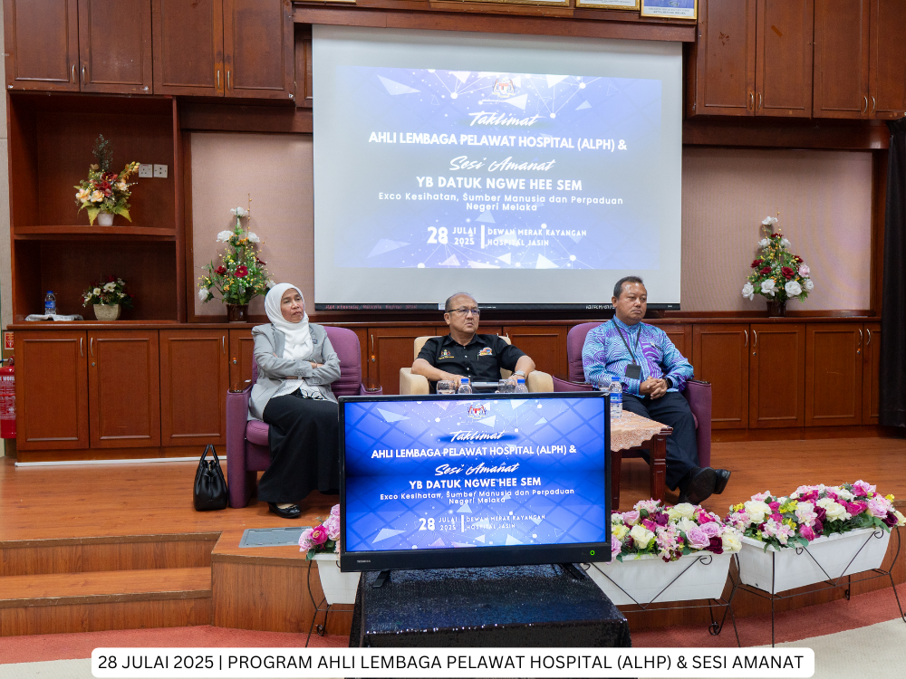 Hospital Jasin | 28 Julai 2025 - Hospital Jasin mengalu-alukan kedatangan YB Datuk Ngwe Hee Sem, EXCO Kesihatan, Sumber Manusia dan Perpaduan Negeri Melaka bagi merasmikan program Taklimat Ahli Lembaga Pelawat Hospital (ALPH) Negeri Melaka & Sesi Amanat YB EXCO Kesihatan, Sumber Manusia dan Perpaduan Negeri Melaka pada 28 Julai 2025 bertempat di Dewan Merak Kayangan, Hospital Jasin. Turut hadir sama adalah YBrs. Dr Ruzita binti Mustaffa, Pengarah Kesihatan Negeri Melaka.