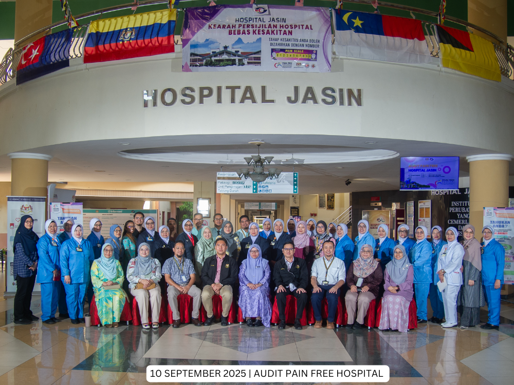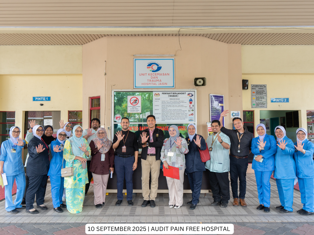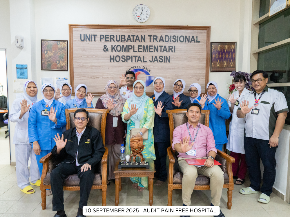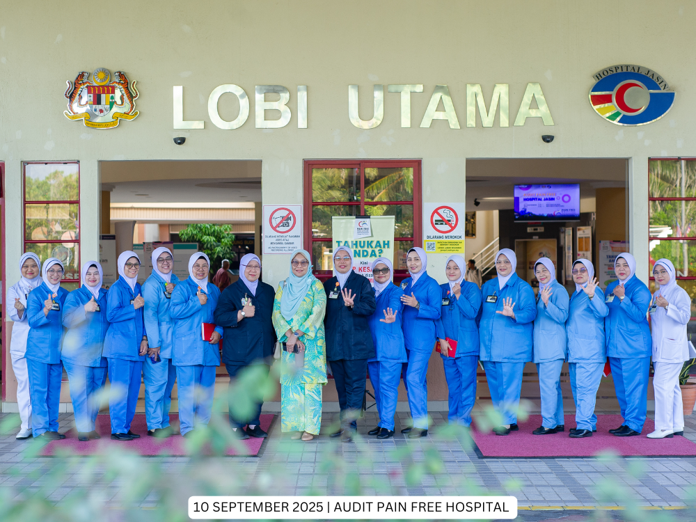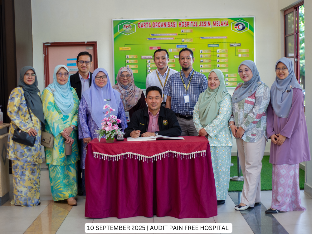 Tahniah kepada Hospital Jasin kerana berjaya menjalani Audit Pensijilan Hospital Bebas Kesakitan (Pain Free Hospital) pada 10 September 2025 dan semoga mendapat kejayaan di dalam pensijilan ini.