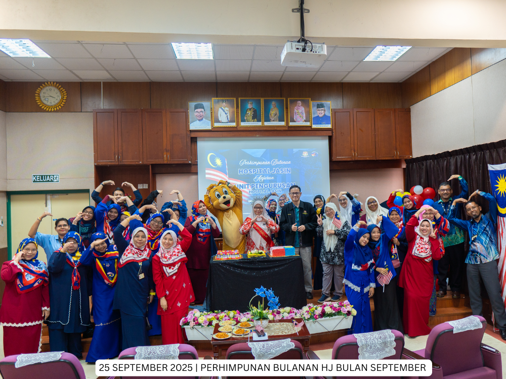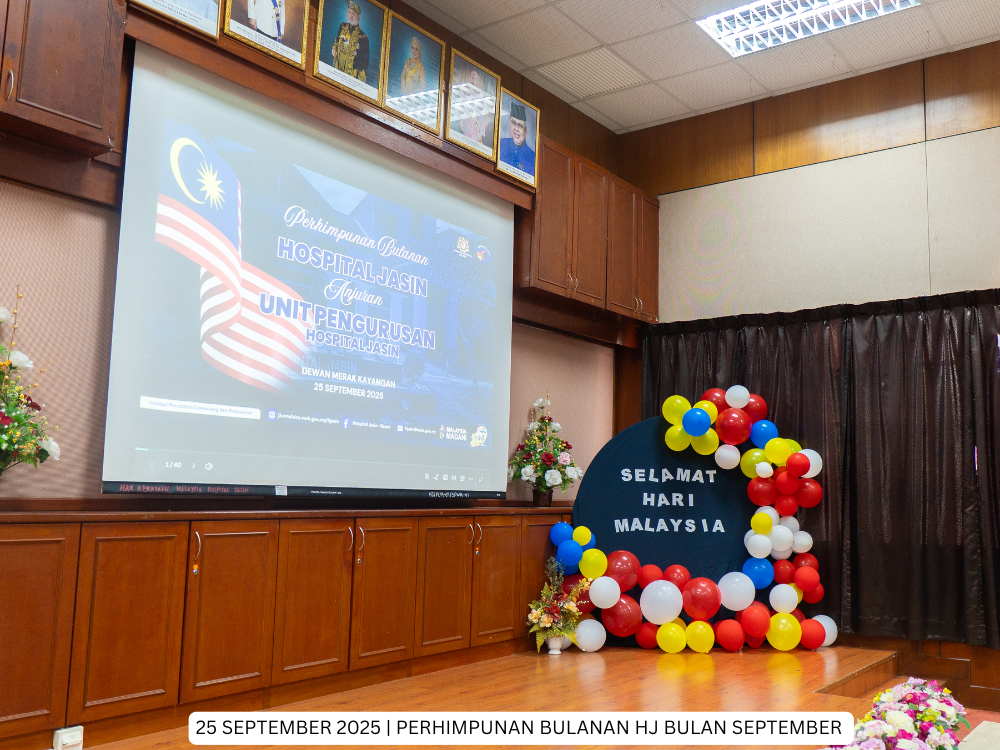 Hospital Jasin | 25 September 2025 - Perhimpunan Bulanan Hospital Jasin bagi bulan September 2025 kali ini telah dianjurkan oleh Unit Pengurusan yang terdiri dari gabungan Unit Pentadbiran & Perkhidmatan, Unit Kewangan, Unit Teknologi Maklumat dan Unit Kejuruteraan dengan tema 'Selamat Hari Malaysia’.