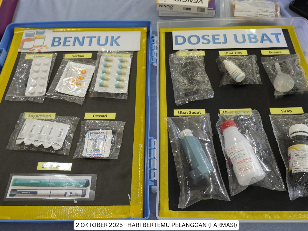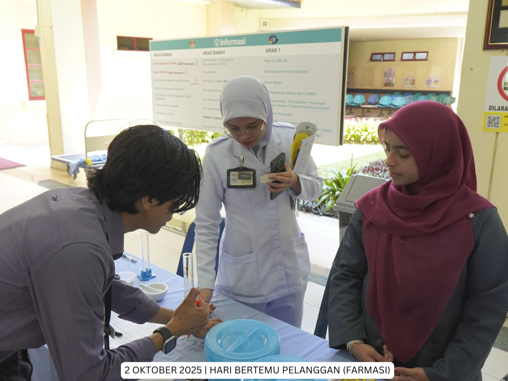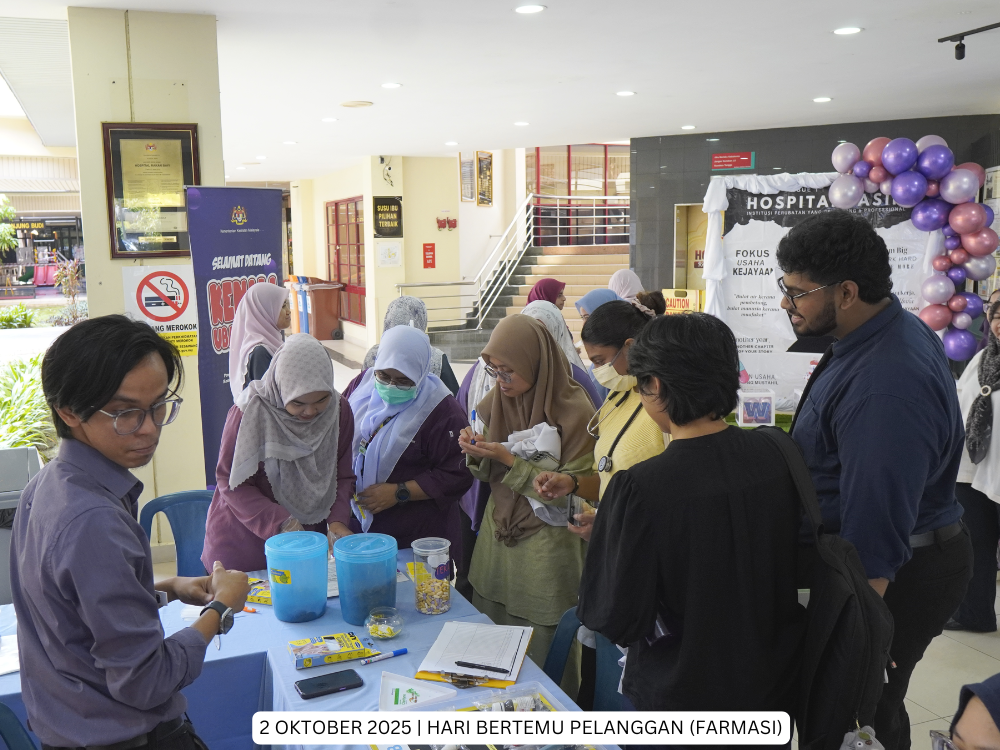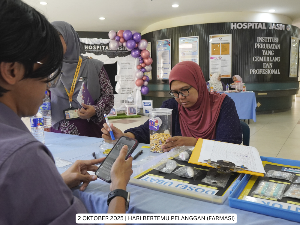 Hospital Jasin | 2 Oktober 2025 - Hari Bertemu Pelanggan Hospital Jasin kali ini telah dianjurkan oleh Unit Farmasi. Pelbagai acara menarik telah disediakan bagi membolehkan warga Hospital Jasin dan orang awam lebih mengenali perkhidmatan yang ditawarkan oleh Unit Farmasi, kerja-kerja di belakang tabir termasuk aktiviti pembungkusan ubat dan penyediaan extempotreaneous serta pameran Kenali Ubat Anda.